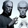 A gaunt, middle-aged man with sharp eyes hidden behind thin spectacles. His grey hair is pulled back into a severe bun, and he wears the simple robes of a monk, making him look almost spectral in the low light. His fingers are long and delicate, often seen tracing patterns in the air as if drawing thoughts.
