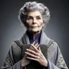 A venerable human woman with eyes like ancient stone, deep-set and wise, framed by a halo of silver curls. Her face is a map of wrinkles, each line etching stories of time passed, with a posture still straight and dignified despite her years. She wears simple, long robes that bear the patterns of ancient Furyan iconography, her fingers often clasping an ancient tome or gesturing to illustrate her points.