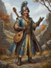 A striking 48-year-old human male with a theatrical presence. His face is dominated by a magnificent, impeccably curled handlebar mustache that ends in sharp points. He has kind, twinkling brown eyes that suggest a life full of stories. He is always dressed in opulent, multi-layered silk robes of vibrant sapphire and gold, intricately embroidered with scenes of mythical beasts and legendary heroes. On his head sits a dazzling bejeweled, open-faced helmet, more ceremonial than practical. Despite his flamboyant attire, his physique is solid, hinting at a life spent on the road and in occasional scuffles. He carries a beautifully crafted lute on his back.