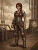 A young woman of striking intensity, standing at 5'6" with soot-stained, olive skin and hair the color of burnt umber, often tied back in a utilitarian braid woven with copper wire. Her eyes are a piercing amber, constantly darting as if analyzing the structural integrity of everything around her. She wears worn, heavy leather armor reinforced with steel plates, battered from service but meticulously maintained. A distinctive burn scar travels up her left arm, partially hidden by an intricate, glowing rune tattoo—the Mark of her Oath to the Arcanist Corps. She moves with measured steps, the weight of her heavy tool belt and boots grounding her otherwise fiery energy.