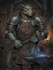 A massive, imposing Dragonborn whose once-gleaming silver scales have been dulled to the color of gunmetal by decades of soot and ash. His face is a roadmap of scars, not from battle, but from the volatile shards of BlueGleam Ore exploding during the smelting process. He wears a heavy, lead-lined leather apron over tarnished plate armor that bears the defaced crest of the Meklen family. His eyes are milky and jaundice-yellow, darting constantly to the shadows, and his hands are perpetually stained with a shimmering, blueish residue that refuses to wash off. He carries the smell of ozone and dried blood.